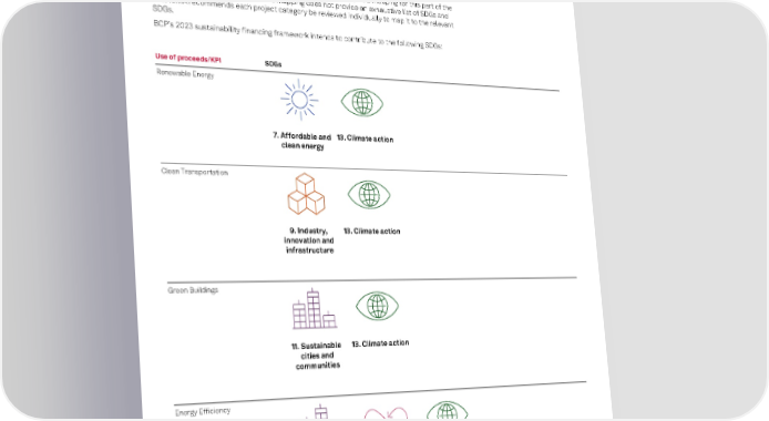 Second Party Opinion s pglobal.com/ ratings This product is not a credit rating July 14, 2023 6 Mapping To The U .N. 's Sustainable Development Goals Th e Sustainable Development Goals (SDGs) , which the United Nations (U.N.) set up in 2015 , form an agenda for achieving sustainable development by 2030. We use the International Capital Market Association 's (ICMA 's) SDG mapping for this part of the report. We acknowledge that ICMA’s mapping does not provide an exh austive list of SDGs and that ICMA recommends each project category be reviewed individually to map it to the relevant SDGs. BCP ’s 2023 s ustainability financing framework intends to contribute to the following SDGs: Use of proceeds/KPI SDGs Renewable Energy 7. Affordable and clean energy 13. Climate action Clean Transportation 9. Industry, innovation and infrastructure 13. Climate action Green Buildings 11. Sustainable cities and communities 13. Climate action Energy Efficiency 11. Sustainable cities and communities 12. Responsible consumption and production 13. Climate action
