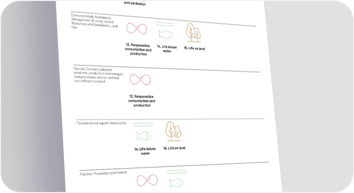 Second Party Opinion s pglobal.com/ ratings This product is not a credit rating July 14, 2023 7 Sustainable water and wastewater management 6. Clean water and sanitation Environmentally Sustainable Management of Living Natural Resources and Sustainable Land Use 12. Responsible consumption and production 14. Life below water 15. Life on land Circular Economy adapted products, production technologies and processes; and/or certified eco -efficient product 12. Responsible consumption and production Terrestrial and aquatic biodiversity 14. Life below water 15. Life on land Pollution Prevention and Control 12. Responsible consumption and production 14. Life below water *The eligible project categories link to these SDGs in the ICMA mapping.