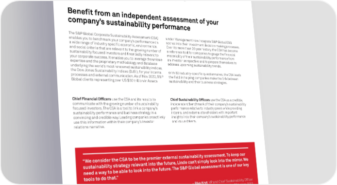 The S&P Gl obal Corporate Sustainability Assessment (CSA) enables you to benchmark your company’s performance on a wide range of industry specific economic, en vironmental and social criteria that are relevant to the growing number of sustainability focused investors and financially relevant to your corporate success. It enables you to leverage the unique expertise and the proprietary methodology and database underlying the world’s most renowned sustainability indices, the Dow Jones Sustainability Indices (DJSI), for your internal processes and external communication. As of Nov 2022, S&P Global clients representing over US $ 30 trillion in Assets Chief Financial Officers use the CSA and its results to communicate with the growing number of sustainability focused investors. The CSA is a tool to link a company’s sustainability performance and business strategy in a convincing and credible way. Leading companies proactively use this information within their company’s investor relations narrative. S&P Global Corporate Sustainability Assessment 01 Benefit from an independent assessment of your company’s sustainability performance under Management now integrate S&P Gl obal ESG scores into their investment decision-making processes. Over its more than 20 year histor y, the CSA has become a reference tool for companies to gauge the financial materiality of their sustainability performance from an investor perspective and to prepare themselves to address upcoming sustainability trends. With 6 2 industry-specific questionnaires, the CSA leads the fiel d in helping companies make the link between sustainability and their business strategies. Chief Sustainability Officers use the CSA as a credible, independent benchmark of their company’s sustainability performance relative to industry peers while providing internal and external stakeholders with important insights into their company’s sustainability performance and value drivers. “We consider the CSA to be the premier external sustainability assessment. To keep our sustainability strategy relevant into the future, Linde can’t simply look into the mirror. We need a way to be able to look into the future. The S&P Global assessment is one of our key tools to do that.” – Riva Krut , VP and Chief Sustainability Officer Linde Plc., USA, participating in the CSA since 2003 Learn more about the benefits of active participation in the CSA at spglobal.com/esg/csa 2