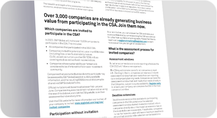 Participation in the CSA helps ESG, IR and other departments such as procurement or HR to collaborate more closely in putting their company’s ESG performance into context, explaining how challenges are addressed and how the company intends to create value in the long term. The breadth and depth of the assessment across the economic, environmental and social dimensions gives The CSA as your IR toolkit — stay ahead of the curve Corporate Sustainability Assessment companies a unique opportunity to highlight their sustainability strengths in areas that might not be covered by traditional sustainability reports. For the past 24 years, the CSA has addressed sustainability issues before they have entered the agenda of other investors or regulators. As a result, active participation in the CSA has helped many companies to future- proof their business and stand out as ESG leaders. Over 3 , 0 00 companies are already generating business value from participating in the CSA. Join them now. More information regarding the assessment timeline is available at: www.spglobal.com/esg/csa/csa-timeline Which companies are invited to participate in the CSA ? In 2023, S&P Global will invite over 13,000 companies to participate in the CSA. This includes: • All companies that participated in the 2022 CSA. • Companies invited for potential inclusion in an ESG Index (including Dow Jones Sustainability Indices (DJSI), as well as numerous other S&P ESG indices covering stock as well as fixed-income indices. • Companies whose sustainability performance is considered to be of interest to the broader investment community. Companies that are invited but decide not to participate may be assessed by S&P Global based on publicly available information, and the resulting ESG Scores and data may be shared via S&P Global platforms. Official invitations will be sent out between February and June. Companies may also check their invitation status using the search tool above, and visit the CSA portal to book their assessment window at any time. Visit the CSA website for more information and to check if your company is invited: www.spglobal.com/esg/csa/ invited- companies Participation without invitation Any company interested in the CSA that agrees to make their resulting ESG Score public on S&P Global platforms will be assessed free of charge. Please contact [email protected] f or more information. As a non-invitee, you can answer the CSA and keep your score confidential by commissioning the CSA as a service for a fee from our Benchmarking team. Please feel free to reach out to [email protected] to learn more about how you can get an assessment. What is the assessment process for invited companies ? Assessment windows To better accommodate corporate reporting schedules the CSA 2023 will follow a new approach. The CSA questionnaire opens for all companies on April 4th. Starting in March, companies can reserve a 2-month assessment window that best meets their own reporting cycle and project planning needs. Companies can book the assessment window that best meets their needs directly in the CSA portal, subject to quota availability. Register early to ensure your company can complete the CSA in the most convenient window. Deadline extensions Deadline extensions will be available to participating companies in the CSA portal once the selected assessment window started. A selection tool will inform companies directly about the impact an extension has on the expected score release date. If applicable, companies invited for index inclusion will have a maximum deadline to ensure that possible index selection can be based on a participation-based score. Publication of results S&P Global ESG Scores calculated from the CSA will be released in monthly waves starting in August, depending on the Assessment Window chosen. Learn more about the benefits of active participation in the CSA at spglobal.com/esg/csa 6