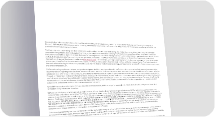 Second Party Opinion s pglobal.com/ ratings This product is not a credit rating J u ly 3 , 2 023 8 Standard & Poor's Financial Services LLC or its affiliates (collectively, S&P) receives compensation for the provision of the Sustainable Financing Opinions product (Product). S&P may also receive compensation for rating the transactions covered by the Pro duct or for rating the issuer of the transactions covered by the Product. The purchaser of the Product may be the issuer. The Product is not a credit rating, and does not consider credit quality or factor into our credit ratings. The Product does not cons ider, state or imply the likelihood of completion of any projects covered by a given financing, or the completion of a proposed financing. The Product encompasses Second Party Opinions and Transaction Evaluations. Second Party Opinions consider features of a financing transaction and/or financing framework and provide an opinion regarding alignment with certain third - party published sustainable finance principles and guidelines (“Principles”). For a list of the Principles addressed by our Second Party Opini ons, see the Analytical Approach and Analytical Supplement, available at www.spglobal.com .Transaction Evaluations provide an opinion which reflects our assessment of the potential relative environmental benefit of th e funded or resilience projects . The Product is a statement of opinion and is neither a verification nor a certification. The Product is a point in time evaluation reflecting the information provided to us at the time that the Product was created and publi shed, and is not surveilled. The Product is not a research report and is not intended as such. S&P's credit ratings, opinions, analyses, rating acknowledgment decisions, any views reflected in the Product and the output of the Product are not investment ad vice, recommendations regarding credit decisions, recommendations to purchase, hold, or sell any securities or to make any investme nt decisions, an offer to buy or sell or the solicitation of an offer to buy or sell any security, endorsements of the suitab ility of any security, endorsements of the accuracy of any data or conclusions provided in the Product, or independent verification of any information relied upon in the credit rating process. The Product and any associa ted presentations do not take into a ccount any user’s financial objectives, financial situation, needs or means, and should not be relied upon by users for making any inves tment decisions. The output of the Product is not a substitute for a user’s independent judgment and expertise. The outp ut of the Product is not professional financial, tax or legal advice, and users should obtain independent, professional advice as it is determined necessary by users. While S&P has obtained information from sources it believes to be reliable, S&P does not perform an audit and undertakes no duty of due diligence or independent verification of any information it receives. S&P and any third -party providers, as well as their directors, officers, shareholders, employees or agents (collectively S&P Parties) do not guarantee the accuracy, completeness, timeliness or availability of the Product. S&P Parties are not responsible for any errors or omissions (neglige nt or otherwise), regardless of the cause, for reliance of use of information in the Product, or for th e security or maintenance of any information transmitted via the Internet, or for the accuracy of the information in the Product. The Product is provided on an “AS IS” basis. S&P PARTIES MAKE NO REPRESENTATION OR WARRANTY, EXPRESS OR IMPLIED, INC LUDED BUT NOT LIMITED TO, THE ACCURACY, RESULTS, TIM ELINESS, COMPLETENESS, MERCHANTABILITY OR FITNESS FOR ANY PARTICULAR PURPOSE WITH RESPECT TO THE PRODUCT, OR FOR THE SECURITY OF THE WEBSITE FROM WHICH THE PRODUCT IS ACCESSED. S&P Parties have no responsibility to maintain or update the Product or to supply any corrections, updates or releases in connection therewith. S&P Parties have no liability for the accuracy, timeliness, reliabi lity, performance, continued availability, completeness or delays, omissions, or i nterruptions in the delivery of the Product. To the extent permitted by law, in no event shall the S&P Parties be liable to any party for any direct, indirect, incidental , exemplary, compensatory, punitive, special or consequential damages, costs, expense s, legal fees, or losses (including, without limitation, lost income or lost profits and opportunity costs or losses caused b y negligence, loss of data, cost of substitute materials, cost of capital, or claims of any third party) in connection with any use of the Product even if advised of the possibility of such damages. S&P maintains a separation between commercial and analytic activities. S&P keeps certain activities of its business units sep arate from each other in order to preserve the independence an d objectivity of their respective activities. As a result, certain business units of S&P may have information that is not ava ilable to other S&P business units. S&P has established policies and procedures to maintain the confidentiality of certain nonpubli c information received in connection with each analytical process. For PRC only: Any “Sustainable Financing Opinions” or “assessment” assigned by S&P Global Ratings: (a) does not constitute a credit rating, rating, sustainable financing framework verification, certification or evaluation as required under any relevant PRC laws or regulations, and (b) is not intended for use within the PRC for any purpose which is not permitted under relevant PRC laws or regulations. For the purpose of this section, “PRC” refers to the mainland of the People’s Republic of China, excluding Hong Kong, Macau and Taiwan. Copyright © 2023 by Standard & Poor’s Financial Services LLC. All rights reserved.