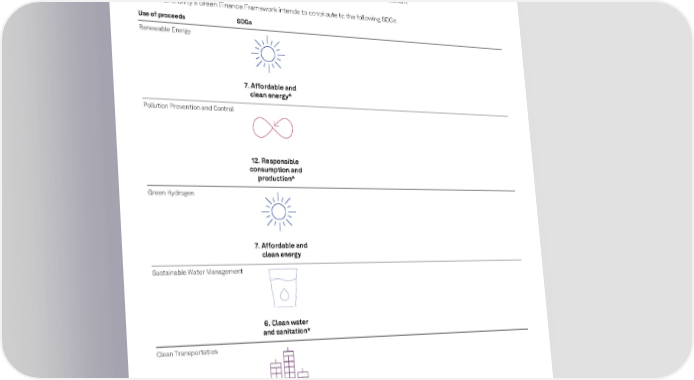 Second Party Opinion s pglobal.com/ ratings This product is not a credit rating J u ly 3 , 2 023 6 Mapping To The U .N. 's Sustainable Development Goals The Sustainable Development Goals (SDGs) , which the U.N. set up in 2015 , form an agenda for achieving sustainable development by 2030. We use the International Capital Market Association 's (ICMA) SDG mapping for this part of the report. We acknowledge that ICMA ’s mapping does not provide an exh austive list of SDGs and that ICMA recommends each project category be reviewed individually to map it to the relevant SDGs. Doosan Ene rbility ’s Green Finance Framework intends to contribute to the following SDGs: Use of proceeds SDGs Renewable Energy 7. Affordable and clean energy * Pollution Prevention and Control 12. Responsible consumption and production * Green Hydrogen 7. Affordable and clean energy Sustainable Water Management 6. Clean water and sanitation * Clean Transportation 11. Sustainable cities and communities *