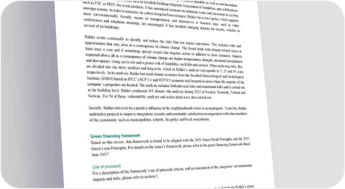 ‘Second Opinion’ on Balder ’s Green Financing Framework 6 was 69.9 tCO 2 e equally from electricity and heat, while Scope 3 emissions was 188 tCO 2 e where new construction (including embodied emissions 5 ) and tenant ’s energy used were major contributors. Scope 1+2 emi ssions intensity was 12.3 kg CO 2 e/m 2 , while Scope 3 intensity was 32.2 kgCO 2 e/m 2 for a total emission intensity of 44.4 kgCO 2 e/m 2 . The company’s ambition is to choose renewable sources of energy whenever possible as well as non - hazardous building materials using schemes such as Swedish Building Materials Assessment or SundaHus, and certifications such as FSC or PEFC for wood products. It has introduced measures to minimise waste and encourage re - cycling amongst tenants. In order to minimize its carbon footprint from transport, Balder has a travel policy which supports more environmentally friendly means of transportation, and alternati ves to business trips, such as video conferences and telephone meetings, are encouraged. It has installed charging stations for electric vehicles in several of its buildings. Balder works continually to identify and reduce the risks that can impact opera tions. This includes risks and opportunities that may arise as a consequence of climate change. The Board deals with climate - related issues at least once a year and if something special occurs that requires action in addition to these instances. I mpacts ex pected above all as a consequence of climate change are higher temperatures, drought, increased precipitation and downpours, rising sea levels and a greater risk of landslides, rockfalls and erosion. When analysing risks, they are divided into the short, m edium and long term, which in Balder’s analysis corresponds to 5, 25 and 50 years respectively. In its analysis, Balder has used climate scenarios from the Swedish Meteorological and Hydrological Institute (SMHI) based on IPCC’s RCP 2.6 and RCP 8.5 scenari os and focused on areas where the majority of the company’s properties are located. The analysis includes both physical risks and transitional risks and is carried out at the building level . Balder conducted 105 climate risk analyses during 2022 in Sweden, Denmark, Finland and Norway. For 54 of these, vulnerability analyses and action plans were also carried out. Socially, Balder strives to be a positive influence in the neighbourhoods where it owns property. To do this, Balder undertakes projects to impr ove integration, security and community satisfaction in cooperation with other members of the community such as municipalities, schools, the police and local associations. Green financing framework Based on this review, this framework is found to be aligned with the 2021 Green Bond Principles and the 2023 Green Loan Principles . For details on the issuer’s framework, please refer to the green financing framework dated June 2023 6 . Use of proceeds For a description of the framework’s use of proceeds criteria, and an assessment of the categories’ environmental impacts and risk s , please refer to section 2 . Selection Balder has an established process ensuring that eligible green assets are continuously included into Balder’s green asset pool. Potentially eligible green assets will be suggested by project managers and other employees at Balder to the Green Bond Committe e (GBC), consisting of the CFO and the Head of Sustainability. The GBC is responsible for evaluating and selecting assets eligible for g reen funding. 5 Embodied emissions that occur in material extraction, production of products, transport and construction of the properties (Construction stage A1 - A5). 6 The Green Bond Principles are published by the International Capital Markets Association (“ICMA”) . The Green Loan Principles are published by the Loan Market Association (“LMA ”), Asia Pacific Loan Market Association (“APLMA”) and the Loan Syndications and Trading Association (“LSTA”) respectively.