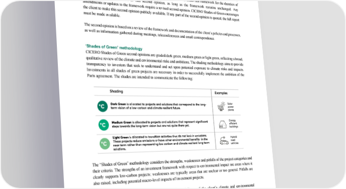 ‘Second Opinion’ on Balder ’s Green Financing Framework 12 3 Terms and methodology This note provides CICERO Shades of Green’s second opinion of the client’s framework dated June 2023 . This second opinion remains relevant to all green bonds and/or loans issued under this framework for the d uration of three years from publication of this second opinion, as long as the framework remains unchanged. Any amendments or updates to the framework require a revised second opinion. CICERO Shades of Green encourages the client to make this second opinio n publicly available. If any part of the second opinion is quoted, the full report must be made available. The second opinion is based on a review of the framework and documentation of the client’s policies and processes, as well as information gathered d uring meetings, teleconferences and email correspondence. ‘Shades of Green’ methodology CICERO Shades of Green second opinions are graded dark green, medium green or light green, reflecting a broad, qualitative review of the climate and environmental risks and ambitions. The shading methodology aims to provide transparency to investors that seek to understand and act upon potential exposure to climate risks and impacts. Investments in all shades of green projects are necessary in order to successfully implement the ambition of the Paris agreement. The shades are intended to communicate the following: The “S hades of G reen ” methodology considers the strengths , weaknesses and pitfalls of the project categories and their criteria . The stre ngths of an investment framework with respect to environmental impact are areas where it clearly supports low - carbon projects; weaknesses are typically areas that are unclear or too general. Pitfalls are also raised , including potential macro - level impacts of investment projects . Sound governance and transparency processes facilitate delivery of the client’s climate and environmental ambitions laid out in the framework. Hence, key governance aspects that can influence the implementation of the green bond a re carefully considered and reflected in the overall shading. CICERO Shades of Green considers four factors in its review of the client’s governance processes: 1) the policies and goals of relevance to the green bond framework; 2) the selection process use d to identify and approve eligible projects under the framework, 3) the management of proceeds and 4) the reporting on the projects to investors. Based on these factors, we assign an overall governance grade: Fair, Good or Excellent. Please note this is no t a substitute for a full evaluation of the governance of the issuing institution, and does not cover, e.g., corruption.