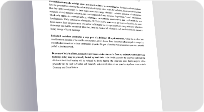 ‘Second Opinion’ on Balder ’s Green Financing Framework 2 P itfalls While Balder’s framework mainly goes beyond applicable building regulations, the one exception is the criterion for existing buildings to be in the top 15% of the building stock and to have some kind of environmental certification. The ambition le vel of this framework criteria we consider to be a Light Green element in the framework . T he top 15% of similar building stock do not guarantee that buildings have energy performance that is in line or better than current regulations . The certification ca n be a design phase, post - construction or in - use certification. Environmental certifications have the potential for reducing the carbon intensity of the real estate sector. Nevertheless , it is important to mention that they differ considerably in their requirements for energy efficiency, embodied emissions of construction materials, related transport emissions, and consideration of climate resilience. In particular, “in - use” certifications , which only applies to existing buildings, offer fewer envi ronmental considerations than certifications for new developments. While certification schemes like BREEAM In - Use secure some environmental qualities, the point - based system does not guarantee a low carbon building and has no requirements on energy efficie ncy other than that energy use shall be monitored. Therefore, there is a risk that full reliance on such standards does not guarantee highly energy efficient buildings. Embodied emissions constitutes a large part of a buildings life cycle emissions. While this is taken into considerations in some of the certification schemes, others do not. Since Balder has not developed an own policy on embodied emissions in their construction projects, this part of the life cycle emissions represents a potential pitfall in the framework. Be aware of lock - in effects, especially when it comes to investments in Germany and the Great Britain where buildings today may be primarily heated by fossil fuels. In the Nordic countries the issuer has confirmed that all direct fossil fuel heating will be replaced by district heating . The issuer also states that the majority of the proceeds will be used in Sweden and Denmark, and currently there are no plans for significant investments in Germany and Great Britain.