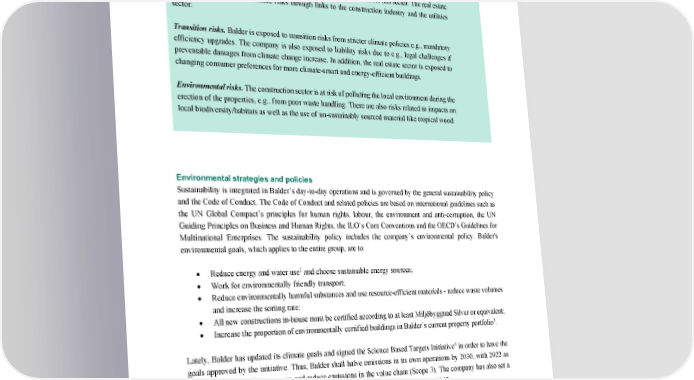 ‘Second Opinion’ on Balder ’s Green Financing Framework 5 E nvironmental strategies and policies Sustainability is integrated in Balder’s day - to - day operations and is governed by the general sustainability policy and the Code of Conduct. The Code of Conduct and related policies are based on international guidelines such as the UN Global Compact’s prin ciples for human rights, labour, the environment and anti - corruption, the UN Guiding Principles on Business and Human Rights, the ILO’s Core Conventions and the OECD’s Guidelines for Multinational Enterprises. The sustainability policy includes the company ’s environmental policy. Balder's environmental goals, which applies to the entire group, are to: • Reduce energy and water use 2 and choose sustainable energy sources; • Work for environmentally friendly transport; • Reduce environmentally harmful substances a nd use resource - efficient materials - r educe waste volumes and increase the sorting rate; • All new constructions in - house must be certified according to at least Milj ö byggnad Silver or equivalent ; • Increase the proportion of environmentally certified build ings in Balder’s current property portfolio 3 . Lately, Balder has updated its climate goals and signed the Science Based Targets Initiative 4 in order to have the goals approved by the initiative. Thus, Balder shall halve emissions in its own operations by 2030, with 2022 as the base year, as well as measure and reduce emissions in the value chain (Scope 3). The company has also set a goal to a chieve net zero emissions throughout the value chain (Scope 1, 2 and 3) by 2045. Balder reported emissions from all its consolidated subsidiaries in Sweden, Denmark, Norway, Finland, Germany and the UK for the first time in 2022 . Scope 1 emissions then re presented 1.5 tCO 2 e mainly from heating , Scope 2 2 More specifically, Balder’s goals are to achieve energy efficiency improvement of 2% per m 2 per annum, reduced water use of 2% per m 2 per annum. In 2022, Balder achieved a 3% energy efficiency improvement, while measu red water use increased by 18.3% . The increase in water use is , according to Balder, partly due to access to more meters and more accurate data in the company ’ s system. 3 The current proportion of certified buildings are under 1%. 4 https://sciencebasedtargets.org Sector risk exposure Physical climate risks . For the Nordic building sector, the most severe physical impacts will likely be increased flooding, snow loads, and urban overflow, as well as in creased storms and extreme weather. Developing projects with climate resilience in mind is critical for this sector. The real estate sector is also exposed to climate risks through links to the construction industry and the utilities sector. Transition ri sks. Balder is exposed to transition risks from stricter climate policies e.g., mandatory efficiency upgrades. The company is also exposed to liability risks due to e.g., legal challenges if preventable damages from climate change increase. In addition, th e real estate sector is exposed to changing consumer preferences for more climate - smart and energy - efficient buildings. Environmental risks. The construction sector is at risk of polluting the local environment during the erection of the properties, e.g., from poor waste handling. There are also risks related to impacts on local biodiversity/habitats as well as the use of un - sustainably sourced material like tropical wood.
