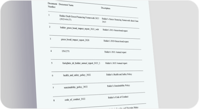 ‘Second Opinion’ on Balder ’s Green Financing Framework 14 Append ix 1: Referenced Documents List Document Number Document Name Description 1 Balder Draft Green Fin ancing Framework 2023 (2023 - 04 - 27) Balder’s Green financing framework dated June 2023 2 balder_green_bond_impact_report_2021_web Balder ’ s 2021 Green bond report 3 green_bond_impact_report_2020 Balder’s 2020 Green bond report 4 1561271 Balder’s 2021 Annual report 5 fastighets_ab_balder_annual_report_2022_2 Balder’s 2022 Annual report 6 health_and_safety_policy_2022 Balder’s Health and Safety Policy 7 sustainability_policy_2022 Balder’s Sustainability Policy 8 code_of_conduct_2022 Balder’s Code of Conduct 9 equality_and_diversity_policy_2022 Balder’s Equality and Diversity Policy 10 transport_and_travel_policy_2022 Balder’s Transport and Travel Policy 11 whistleblowing_policy Balder’s Whistleblowing Policy