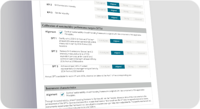 Second Party Opinion s pglobal.com/ ratings This product is not a credit rating | PUBLIC July 10, 2023 3 Second Party Opinion Summary Selection of key performance indicators (KPIs) Alignment ✔ Danhos ’ sustainability - linked financing framework is aligned with this component of the applicable Principles . KPI 1 Sustainable buildings KPI 2 GHG emissions intensity KPI 3 Gender equality Calibration of s ustainability performance targets (SPTs) Alignment ✔ Danhos ’ sustainability - linked financing framework is aligned with this component of the applicable Principles . SPT 1 Certify with LEED O+M Gold and Platinum at least 25% area under operational control measured in sqm by 2034 from a 2022 baseline SPT 2 Reduce GHG emissions (Scope 1 and 2) intensity measured as tons of CO2 equivalent per area under operational control in sqm (t CO2/sqm) at least 45% by 2034 from a 2019 baseline SPT 3 Achieve at least 45% of women representation in management positions by 2034 from a 2022 baseline Annual SPTs available for each KPI until 2034 , observation dates will be April 1 of the corresponding year. Instrument characteristics Alignment ✔ Danhos ’ sustainability - linked financing framework i s aligned with this component of the applicable Principles . Through its s ustainability - l inked financing f ramework, Danhos will link the financial characteristics of the instruments to the achievement of the SPTs. Danhos discloses that in case it achieves or fails to achieve the SPTs by the agreed observation dates, instruments raised under the framework will be subject to coupon step -up or step- down adjustments. The specific mechanism will be included in the respective instrument documentation. Reporting Alignment ✔ Danhos ’ sustainability - linked financing framework is aligned with this component of the applicable Principles . Aligned No t aligned St rong Ad vanced Aligned No t aligned St rong Ad vanced Aligned No t aligned St rong Ad vanced Aligned No t aligned St rong Ad vanced Aligned No t aligned St rong Ad vanced Aligned No t aligned St rong Ad vanced