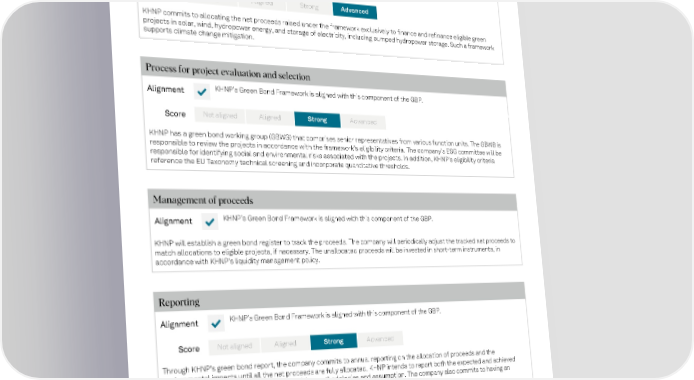 Second Party Opinion s pglobal.com/ ratings This product is not a credit rating Ju ly 7 , 2023 2 Second Party Opinion Summary Use of proceeds Alignment ✔ KHNP ’s Green Bond Framework is aligned with this component of the GBP. Score KHNP commits to allocating the net proceeds raised under the framework exclusi vely to finance and refinance eligible green projects in solar, wind , hydropower energy , and storage of electricity , includ ing pumped hydropower storage . Such a framework support s climate change mitigation. Process for project evaluation and selection Alignment ✔ KHNP ’s Green Bond Framework is aligned with this component of the GBP. Score KHNP has a green bond working group (G BWG) that comprises senior representatives from various function units. The GBWB is responsible to review the projects in accordance with the framework's eligibility criteria. The company's ESG committee will be responsible for identifying social and environmental risks associated with the projects. In addition, KHNP's eligibility criteria reference the EU Taxonomy technical screening and incorporate quantitative thresholds. Management of proceeds Alignment ✔ KHNP ’s Green Bond Framework is aligned with this component of the GBP. KHNP will establish a g reen b ond r egister to track the proceeds. The company will periodically adjust the tracked net proceeds to match allocations to eligible projects, if necessary. The u nallocated proceeds will be invested in short -term instruments , in accordance with KHNP 's liquidity management policy . Reporting Alignment ✔ KHNP ’s Green Bond Framework is aligned with this component of the GBP. Score Through KHNP's green bond report, the company commits to annual reporting on the allocation of proceeds and the environmental impacts until all the net proceeds are fully allocated. KHNP intends to report both the expected and achieved environmental impacts , as well as the underlying methodologies and assumption . The company also commits to having an independent third -party verify its post -issuance allocation and impact reporting . Aligned Not aligned St r ong Ad v anced Aligned Not aligned St r ong Ad vanced Aligned Not aligned St r ong Ad vanced